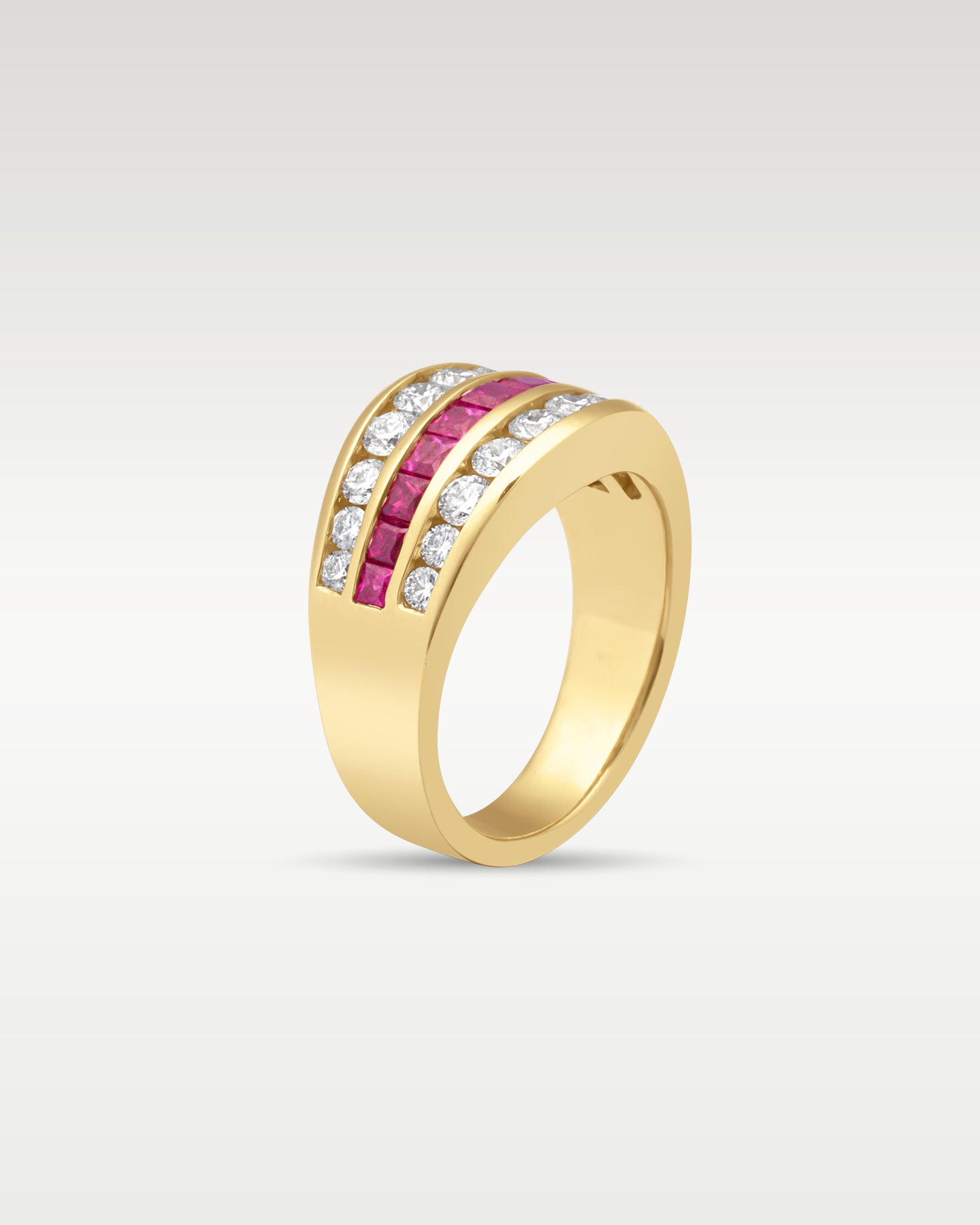With its low-profile silhouette and three rows of gemstones, this ring blends bold color and refined shine. The central row of rubies is bordered by white diamonds for a balanced, eye-catching effect. Wear this band solo for impact or easily stack with other hand jewelry.