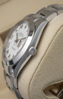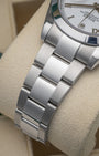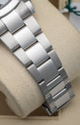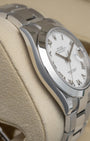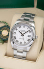 With its 41mm Oystersteel case and bracelet, the Rolex Datejust 126330 exudes understated elegance. The white dial, with raised silver-tone Roman numerals and baton hands, brings a touch of refinement. Powered by the mechanical self-winding caliber 3235, this dress watch provides a 70-hour power reserve. With a smooth bezel rounding out the look, this is versatile Rolex watch is ready for any occasion.