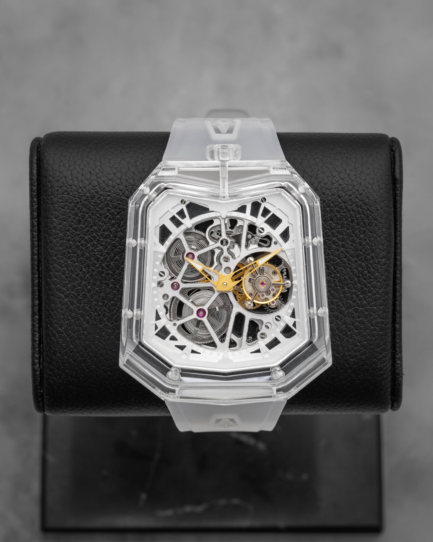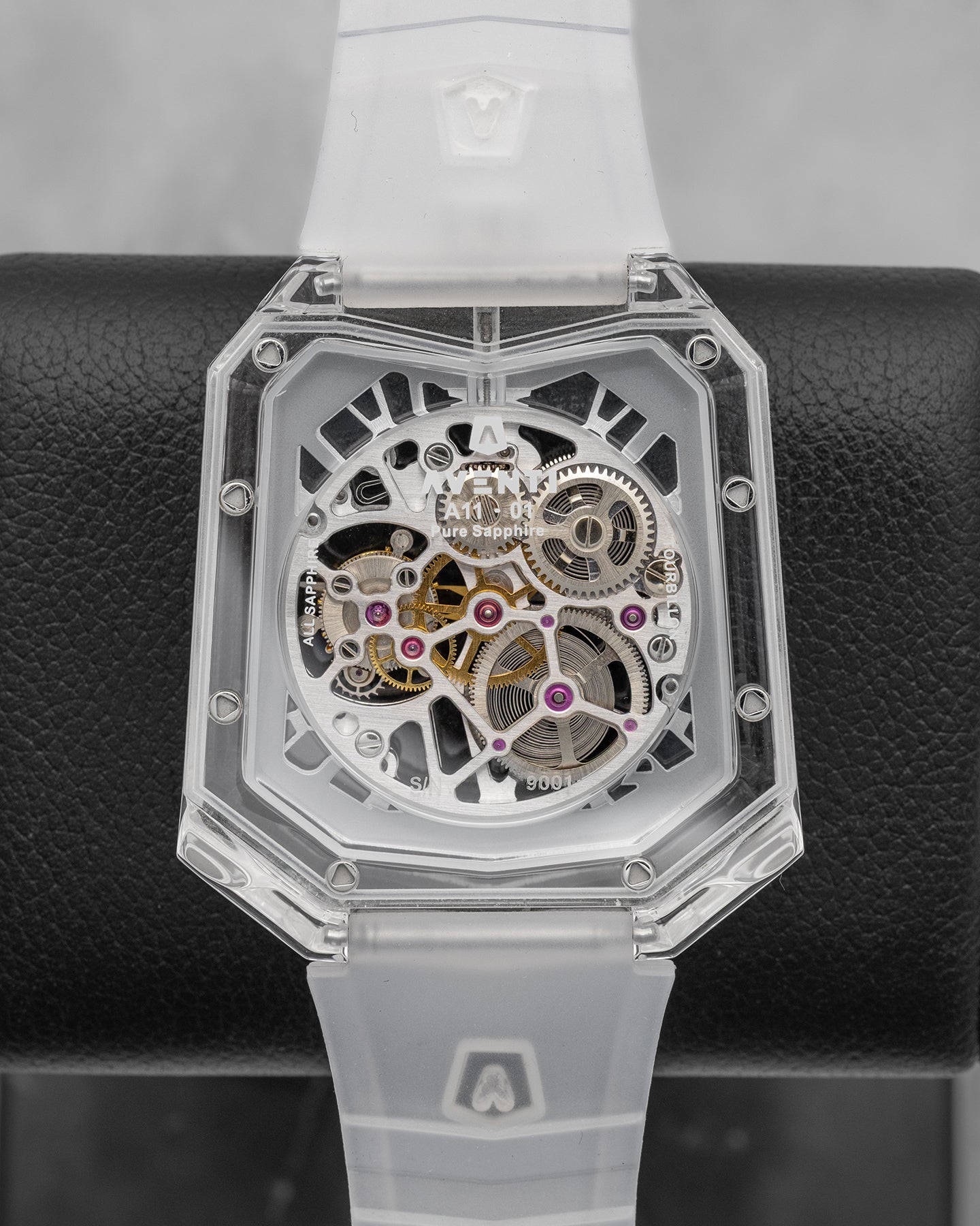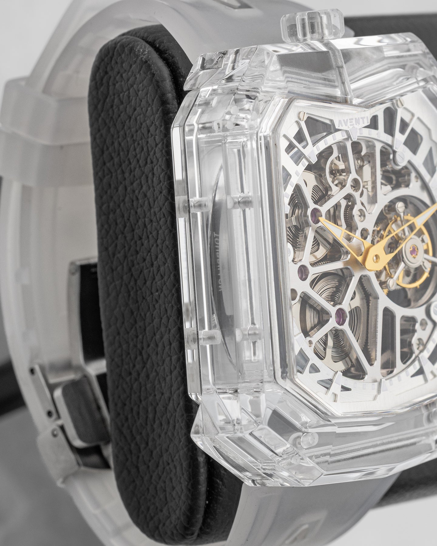 The Aventi Pure Sapphire Crystal Tourbillon A11-01 takes transparency to another level. Its case, cut entirely from sapphire crystal, offers a view from every angle, showing off the hand-finished tourbillon movement suspended inside. With its sharp, hypercar-inspired geometry and skeletonized dial, this Aventi watch feels more like a piece of modern architecture than a traditional dress watch. Paired with a semi-clear silicone strap, it’s light, futuristic and rare.