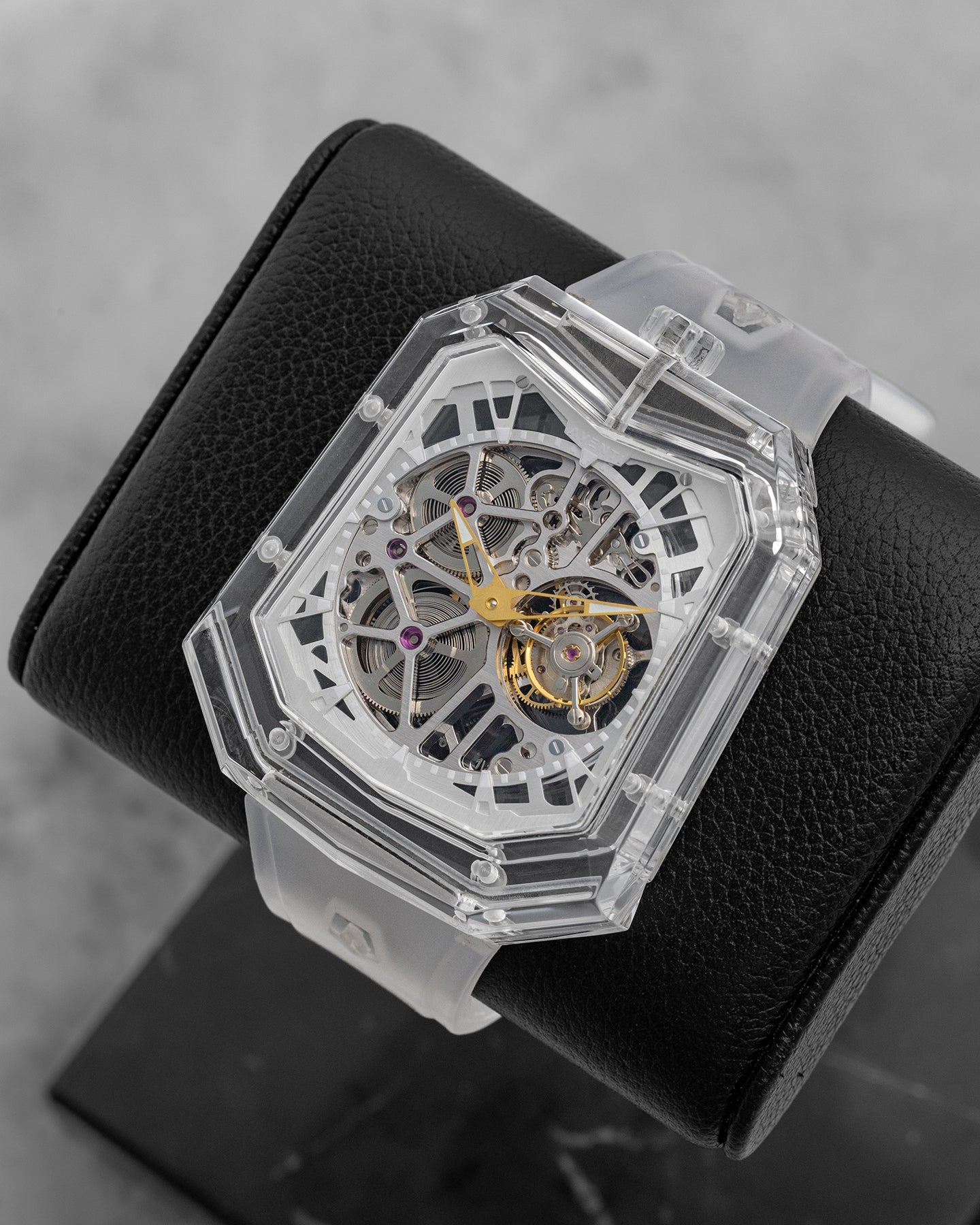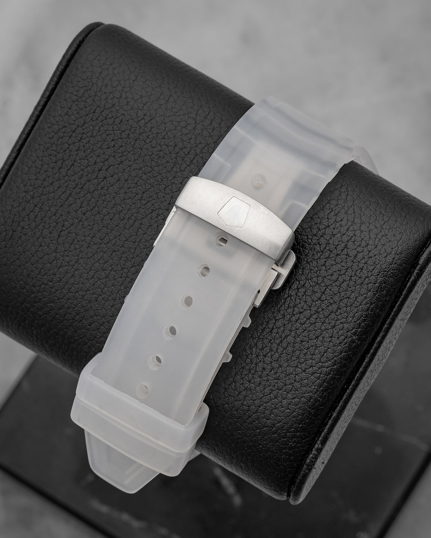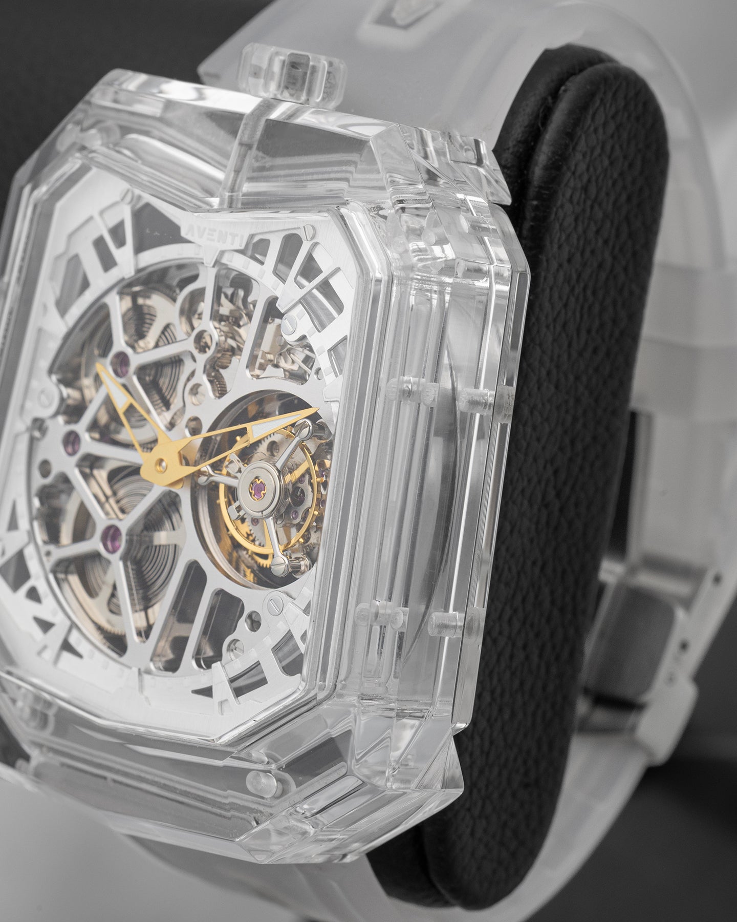 The Aventi Pure Sapphire Crystal Tourbillon A11-01 takes transparency to another level. Its case, cut entirely from sapphire crystal, offers a view from every angle, showing off the hand-finished tourbillon movement suspended inside. With its sharp, hypercar-inspired geometry and skeletonized dial, this Aventi watch feels more like a piece of modern architecture than a traditional dress watch. Paired with a semi-clear silicone strap, it’s light, futuristic and rare.