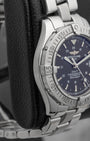 The Breitling Colt Automatic A17350 shows how a sport watch can balance utility and everyday wear. Its 38mm steel case feels solid on the wrist, paired with a black dial that’s all about clarity, with luminous markers and a clean date window. The unidirectional bezel ties back to its diving roots, and the automatic chronometer-certified movement inside guarantees accuracy. It is a Breitling watch that works as well in everyday rotation as it does in the field.