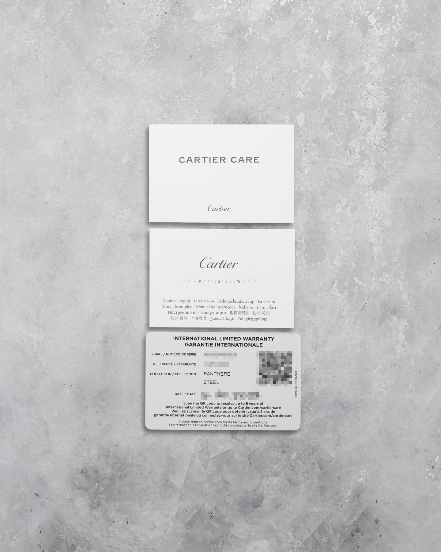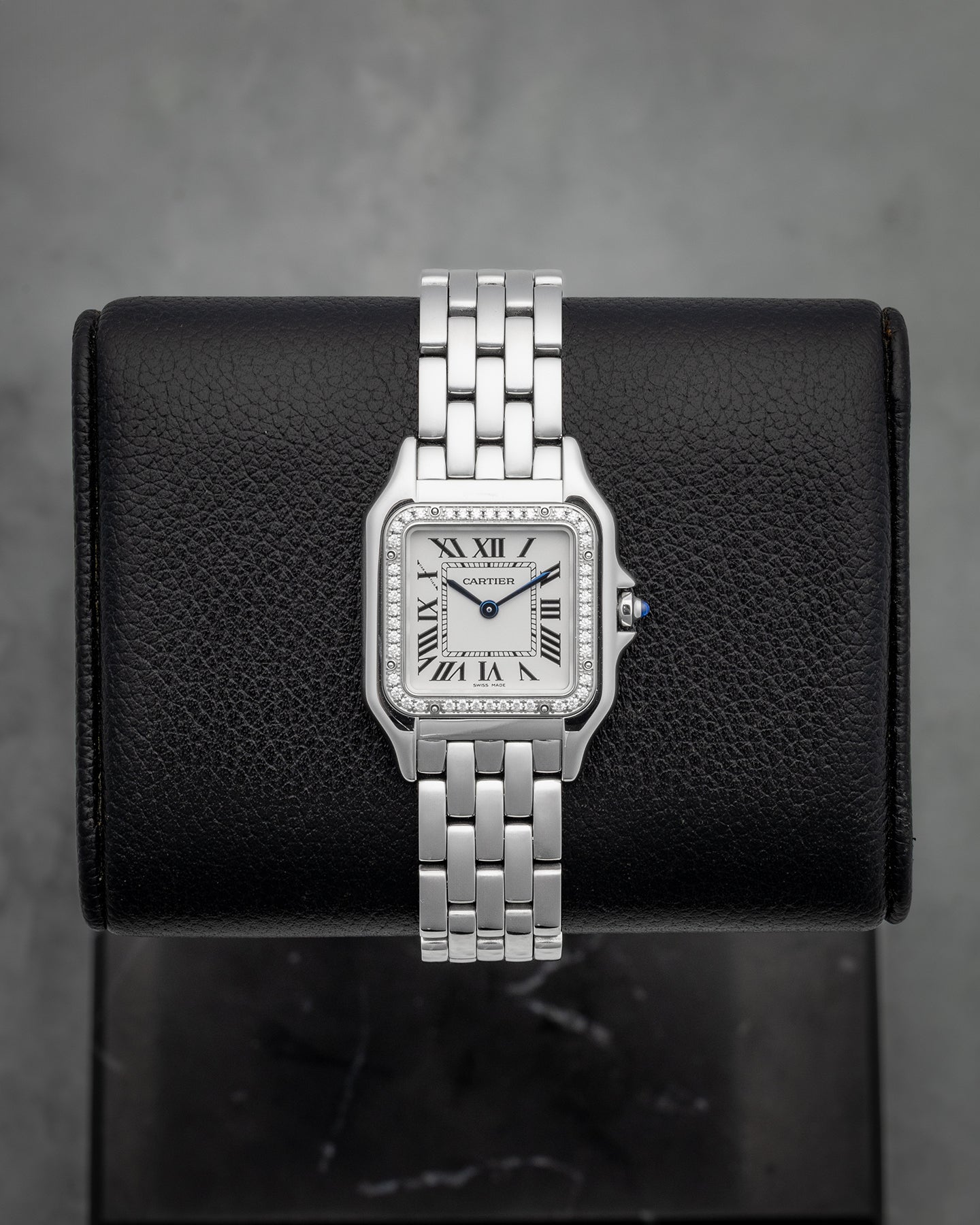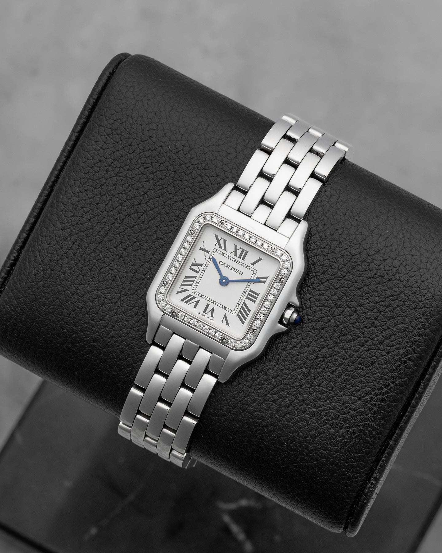 The Panthère de Cartier W4PN0008 is a dress watch that leans into elegance while keeping Cartier’s timeless design codes intact. Its 27mm steel case is framed by a diamond-set bezel that gives just the right amount of sparkle. The silvered dial boasts classic Roman numerals and blued-steel sword hands. Inside is a quartz movement, keeping the focus on style and wearability. Finished with a supple steel bracelet, this Cartier watch is as versatile as it is refined.