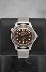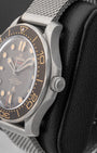 The Omega Seamaster "Bond 007" 210.90.42.20.01.001 merges rugged durability with cinematic flair. This 42mm titanium dive watch sports a brown aluminum bezel, tropical brown dial and titanium mesh bracelet. It features a helium-escape valve and is powered by the caliber 8806 automatic movement with a 55-hour reserve. The engraved 007 logo on the case back completes this iconic sport watch.