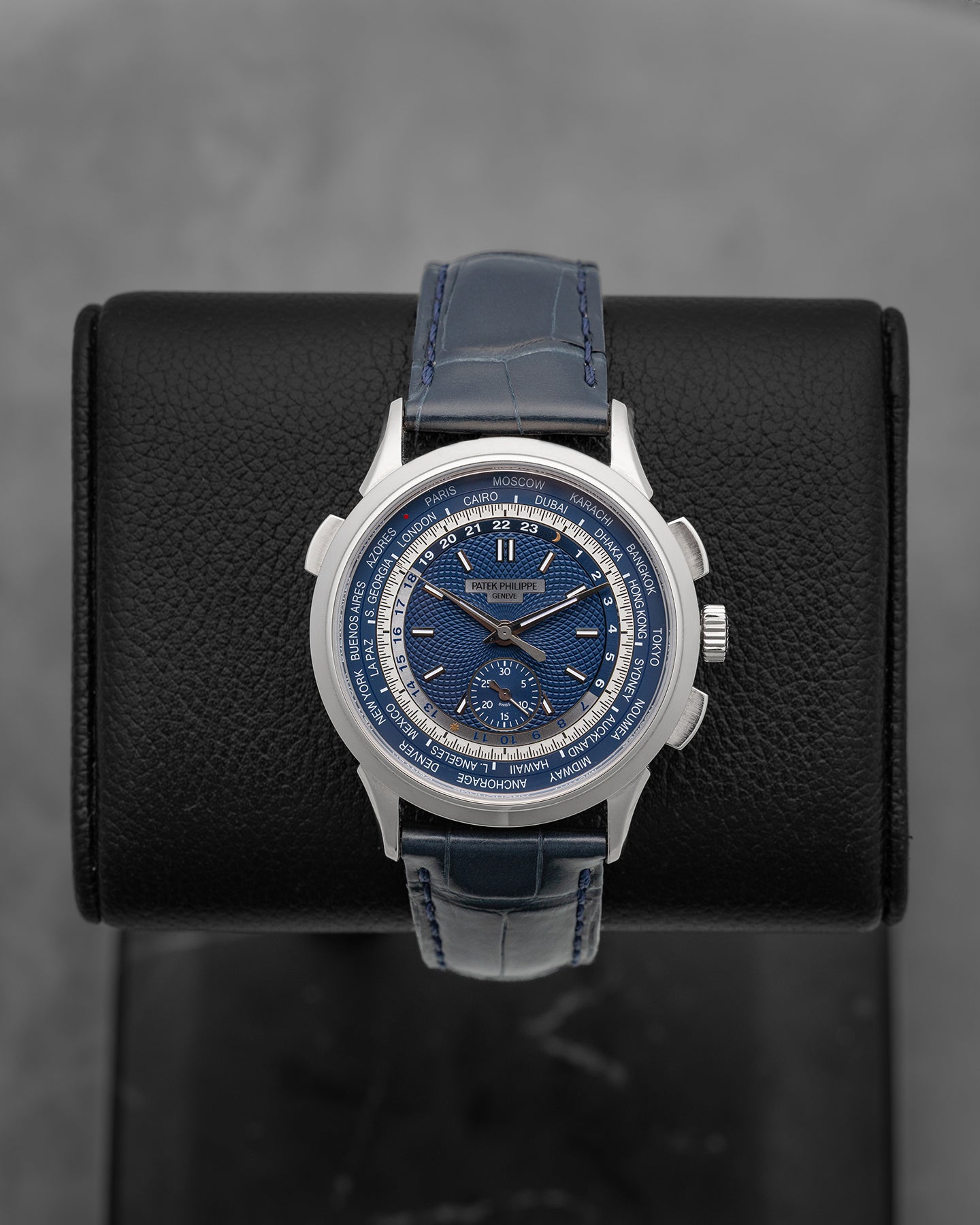 Few watches capture global elegance quite like the Patek Philippe World Time Chronograph 5930G-010. Its 40mm white gold case frames a rich blue guilloché dial with city ring, 24-hour day/night indication, and discreet chronograph layout. The in-house calibre CH 28-520 HU handles both world time and flyback timing functions with typical Patek finesse, offering up to 55 hours of power. Finished on a blue leather strap, this is a dress watch that speaks to the traveler in all of us.