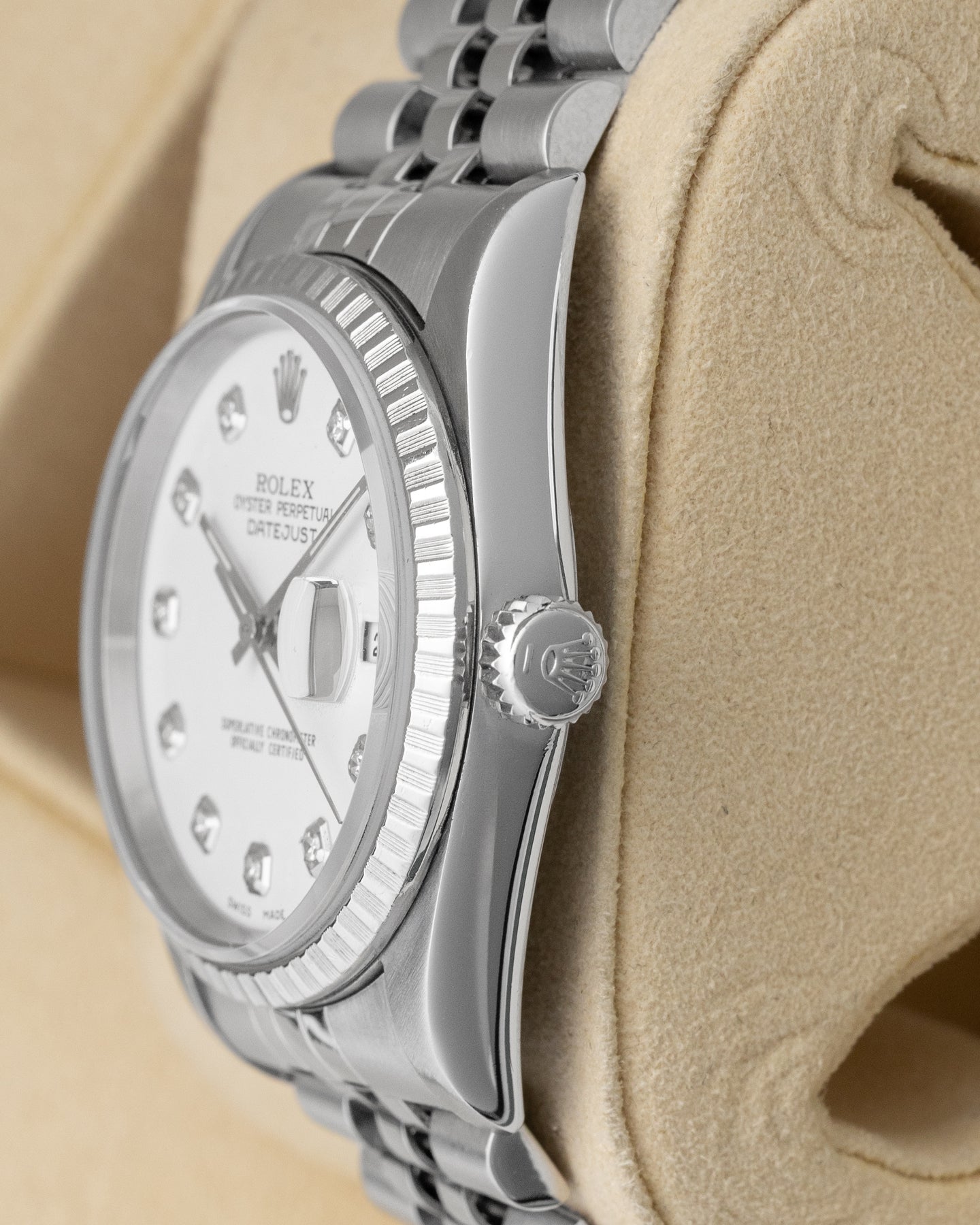 There is a reason the Datejust 16234 still feels relevant decades later. The proportions are spot on, the steel case stays understated and the white gold fluted bezel brings a subtle rhythm to the dress watch's profile. The white diamond dial stands out for its restraint, offering texture and sparkle. Paired with a Jubilee bracelet and backed by the Caliber 3135, this Rolex watch remains dependable, familiar and elegant.