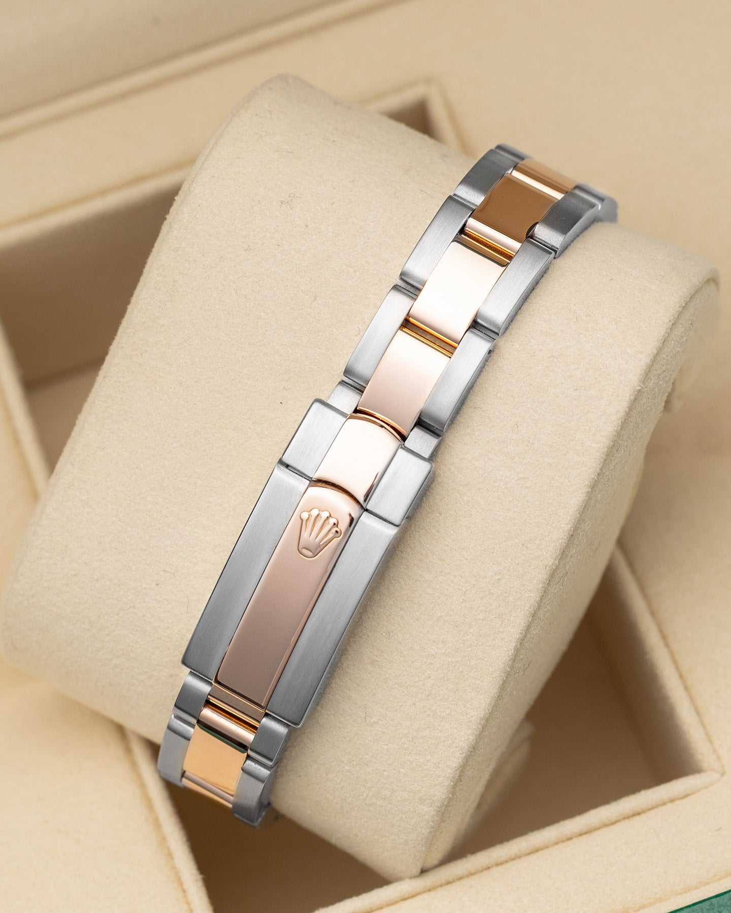 The Rolex Datejust 179161 shows how refined proportions can elevate a design. At 26mm, the two-tone case keeps a subtle presence, while the domed rose gold bezel gives the watch a warm glow. The black dial is clean and legible, fitted with index markers and a date window. Powered by the automatic caliber 2235, this Rolex watch blends precision and elegance. A dress watch that feels discreet yet unmistakably Rolex.