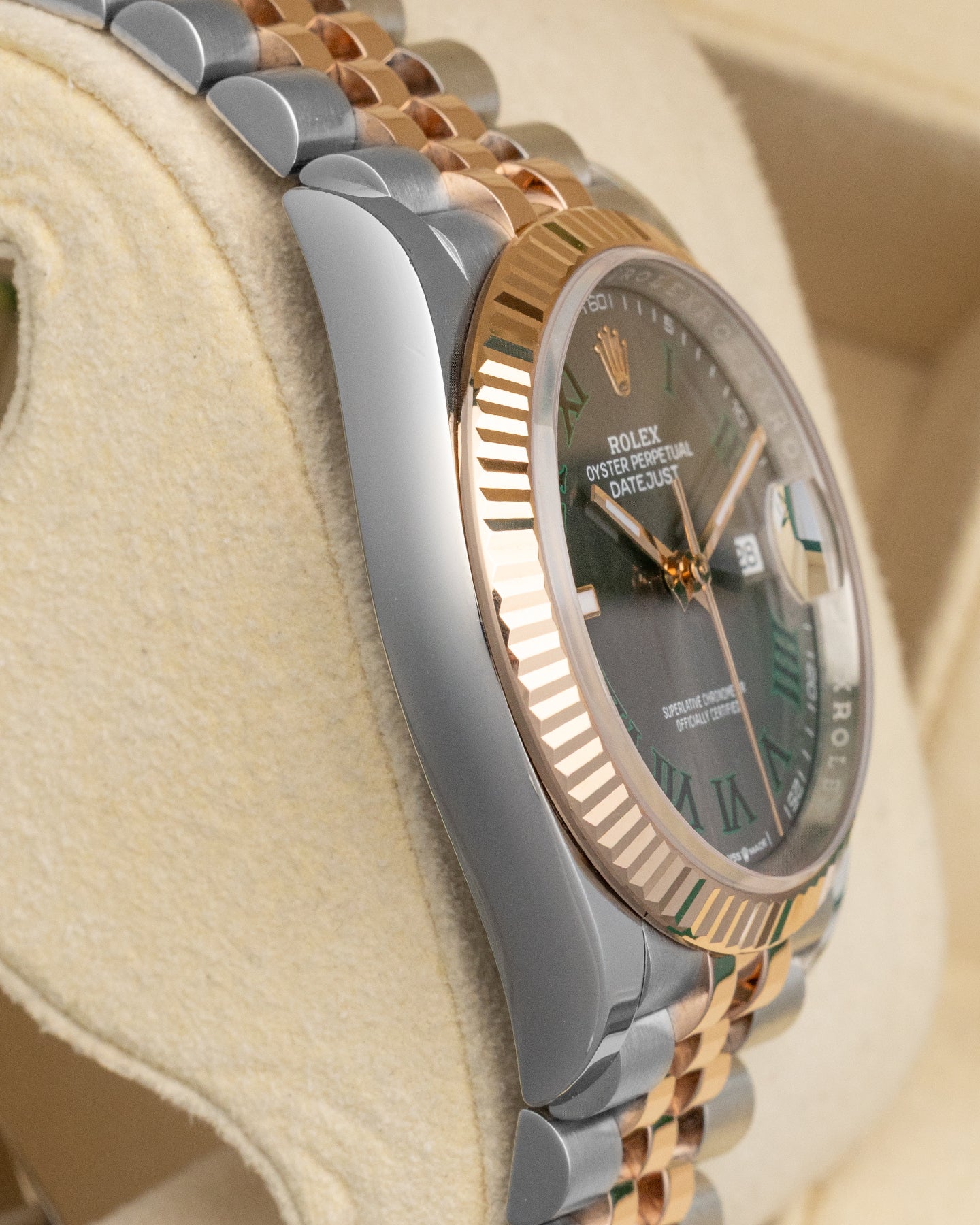 The Datejust 36 126231 stands out through thoughtful color and material pairing. The slate Wimbledon dial sets the tone, framed by a rose gold fluted bezel and matched with a Jubilee bracelet in Everose Rolesor. Driven by the Caliber 3235 with a 70-hour power reserve, this Rolex watch performs with consistency. This is a Datejust that balances tradition with individuality, making it a compelling option in the landscape of modern dress watches.