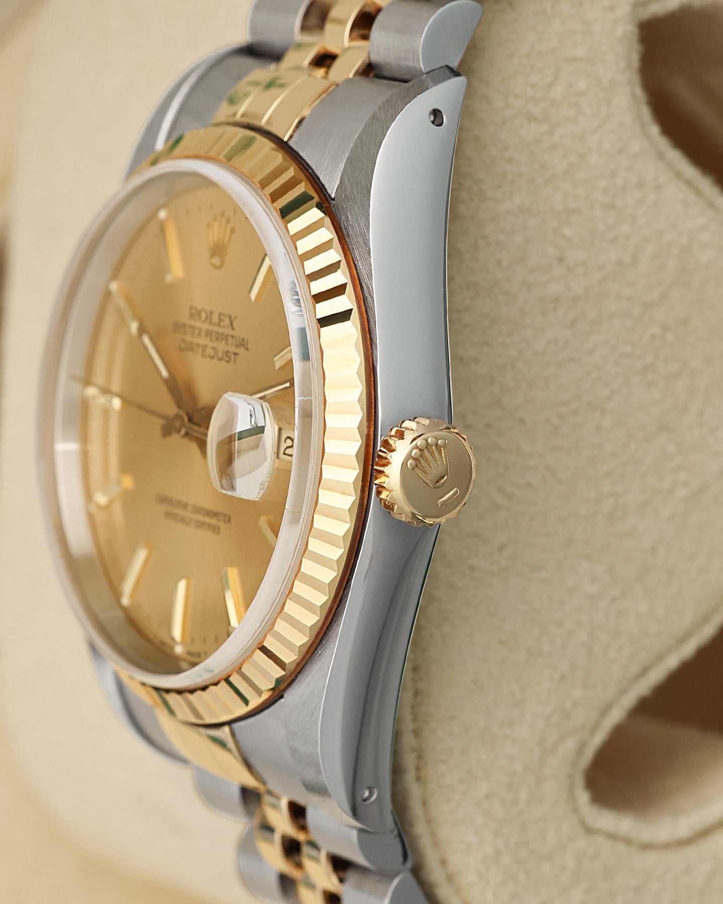 A champagne stick dial and yellow gold fluted bezel give the Datejust 16233 its unmistakable character. The 36mm stainless steel case is paired with gold center links in the Jubilee bracelet, creating the classic Rolesor look long associated with Rolex watches. The automatic Caliber 3135 movement powers the model with dependable precision for up to two days. It remains an elegant interpretation of the everyday dress watch.