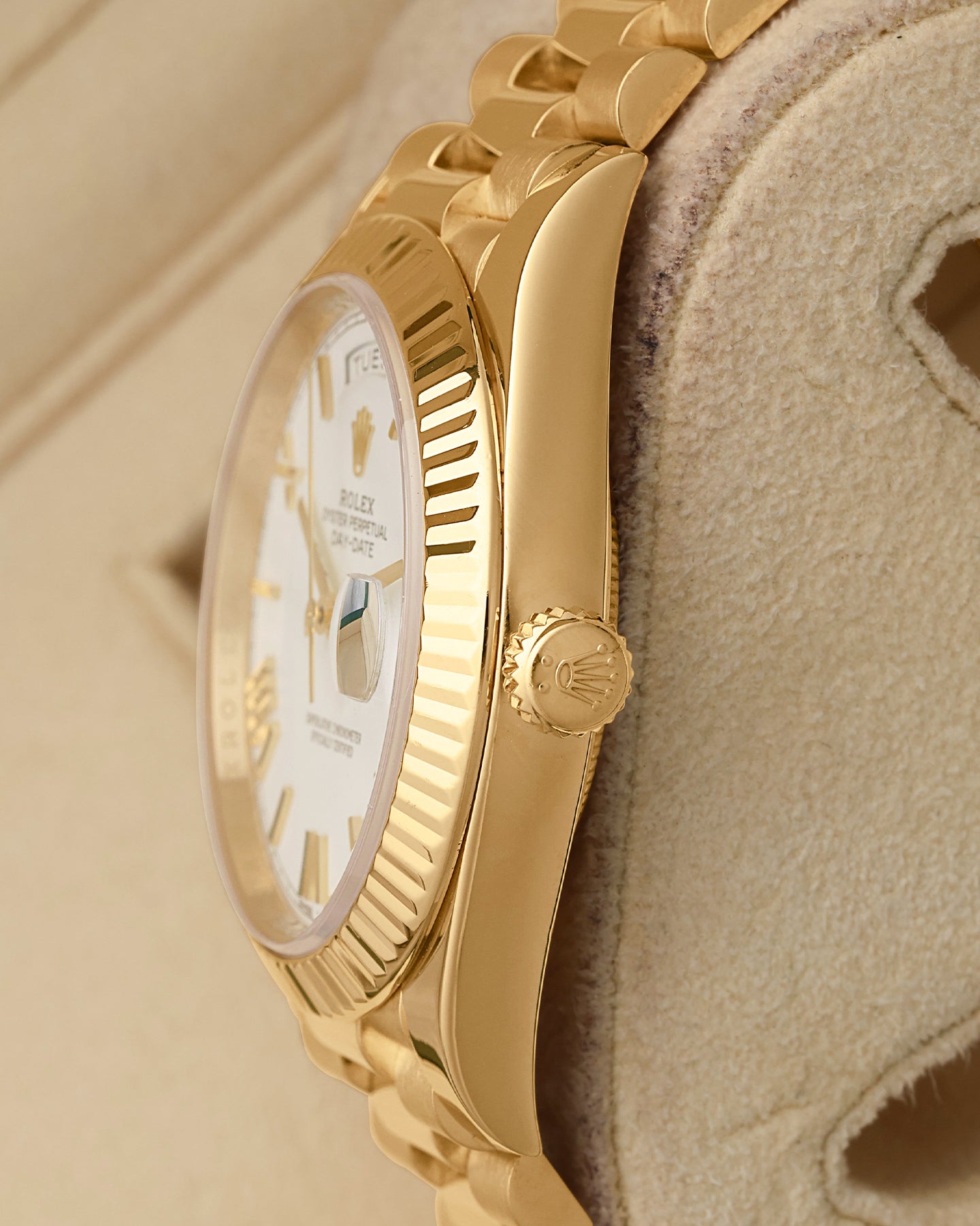 The Day-Date 228238 does not rely on contrast or complication to stand out. Instead, the 40mm yellow gold case, fluted bezel and President bracelet create a unified presence. A white Roman dial organizes the layout, with day and date displays that have defined this Rolex watch for decades. The Caliber 3255 adds technical depth through improved efficiency. It settles into the category of dress watches that tend to stay relevant long after trends have moved on.