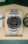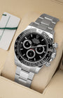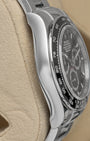 The Daytona 126500LN brings the familiar silhouette into a more refined era. The 40mm steel case is paired with a black ceramic bezel that sharpens the profile and gives this Rolex watch its modern edge. The black dial keeps the layout tidy with balanced subdials and crisp markers that read easily at a glance. Inside, the 4131 movement adds efficiency and smoother chronograph action. A sport watch that settles into any collection effortlessly.