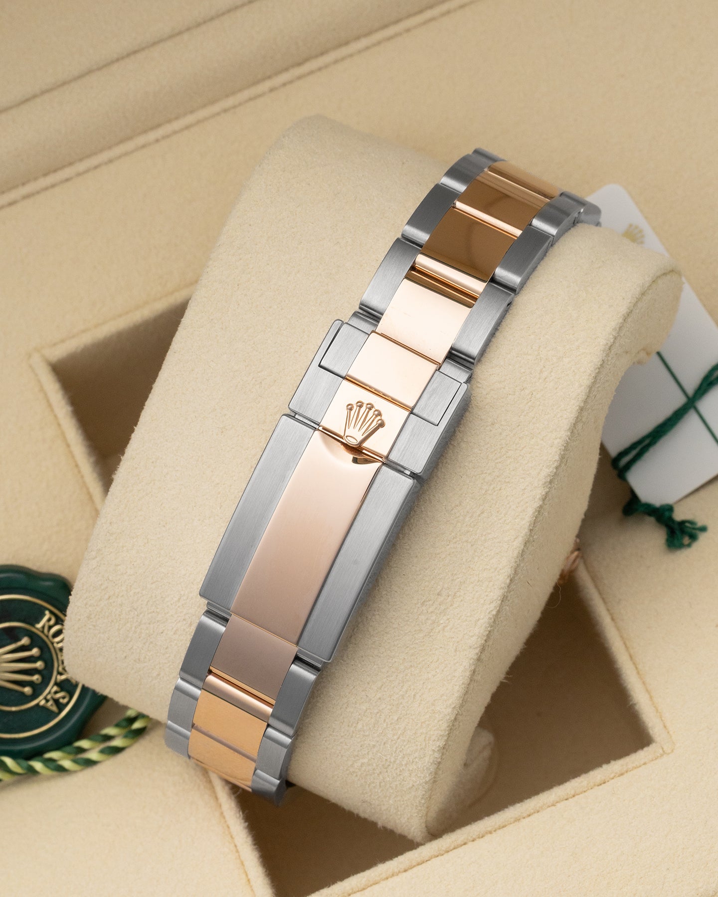 The GMT-Master II sets a different tone with the 126711CHNR. Everose gold accents soften the steel case, creating contrast against the black dial and two tone Root Beer ceramic bezel. The arrow tipped GMT hand keeps a second time zone in view, powered by the Caliber 3285 and its 70 hour reserve. As a sport watch, it carries real function, but the colorway shifts the mood toward something more deliberate and styled within the Rolex watches lineup.