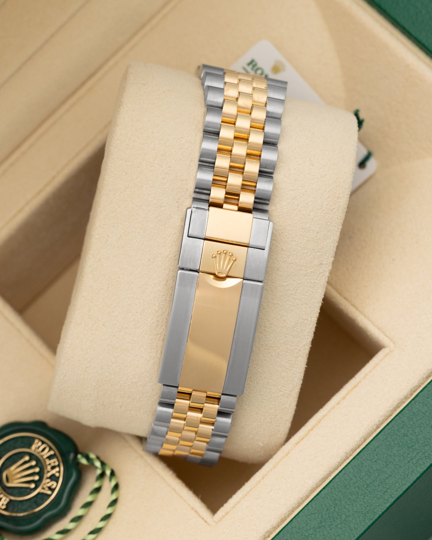 The GMT-Master II 126713GRNR, nicknamed the Zombie, pairs yellow Rolesor with a muted grey and black ceramic bezel for a more understated GMT look. The black dial stays sharp with Chromalight markers and a date at three, while the Caliber 3285 handles dual time tracking with ease. A Rolex watch that earns its place by aging well visually and mechanically. This sport watch offers real travel utility while still reading clean and balanced on the wrist.