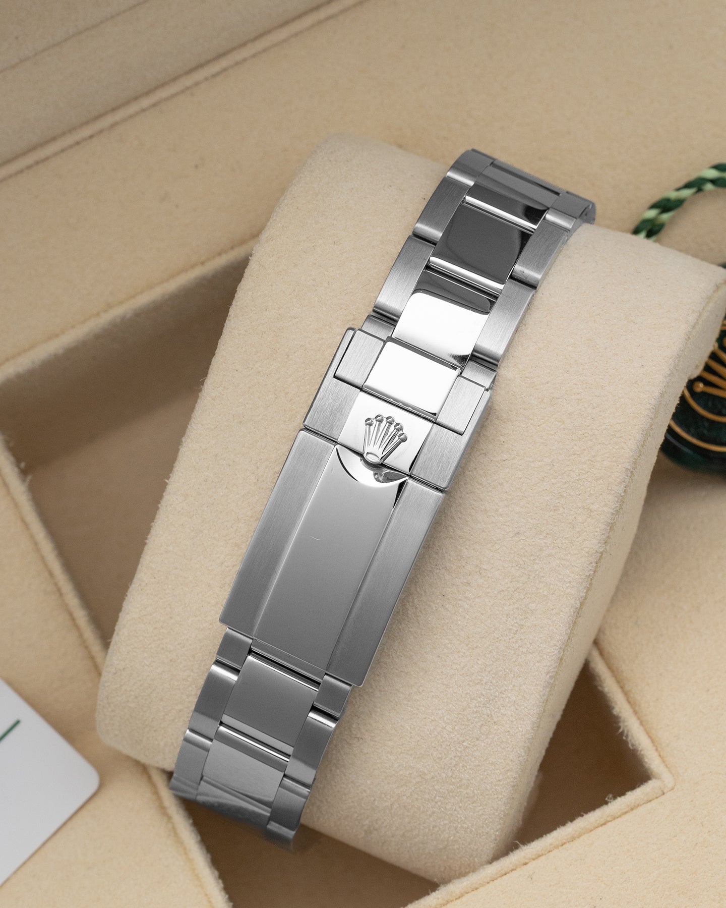 The GMT-Master II 126720VTNR “Sprite” redefines the dual-time sport watch with a left-hand crown and date at nine. Its 40mm steel case is balanced on an Oyster bracelet, while the black and green ceramic bezel allows quick reference to a second time zone. The black dial is clean, with luminous hour markers and a standout green GMT hand. Powered by the in-house Caliber 3285, this Rolex watch delivers precision and a 70-hour power reserve. It is a sport watch that handles travel, work, and weekend plans with equal confidence.