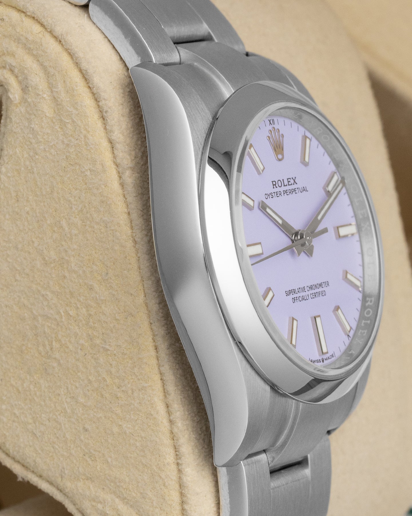 The Oyster Perpetual 124200 proves that smaller proportions still carry impact. The 34mm case sits comfortably on the wrist, framed by a smooth steel bezel and fitted with a lavender dial that feels fresh. Powered by the Caliber 2232 with a 55-hour reserve, this dress watch offers reliable timekeeping in a compact form. A well-proportioned Rolex watch that fits seamlessly into daily wear while still feeling thoughtfully distinct.
