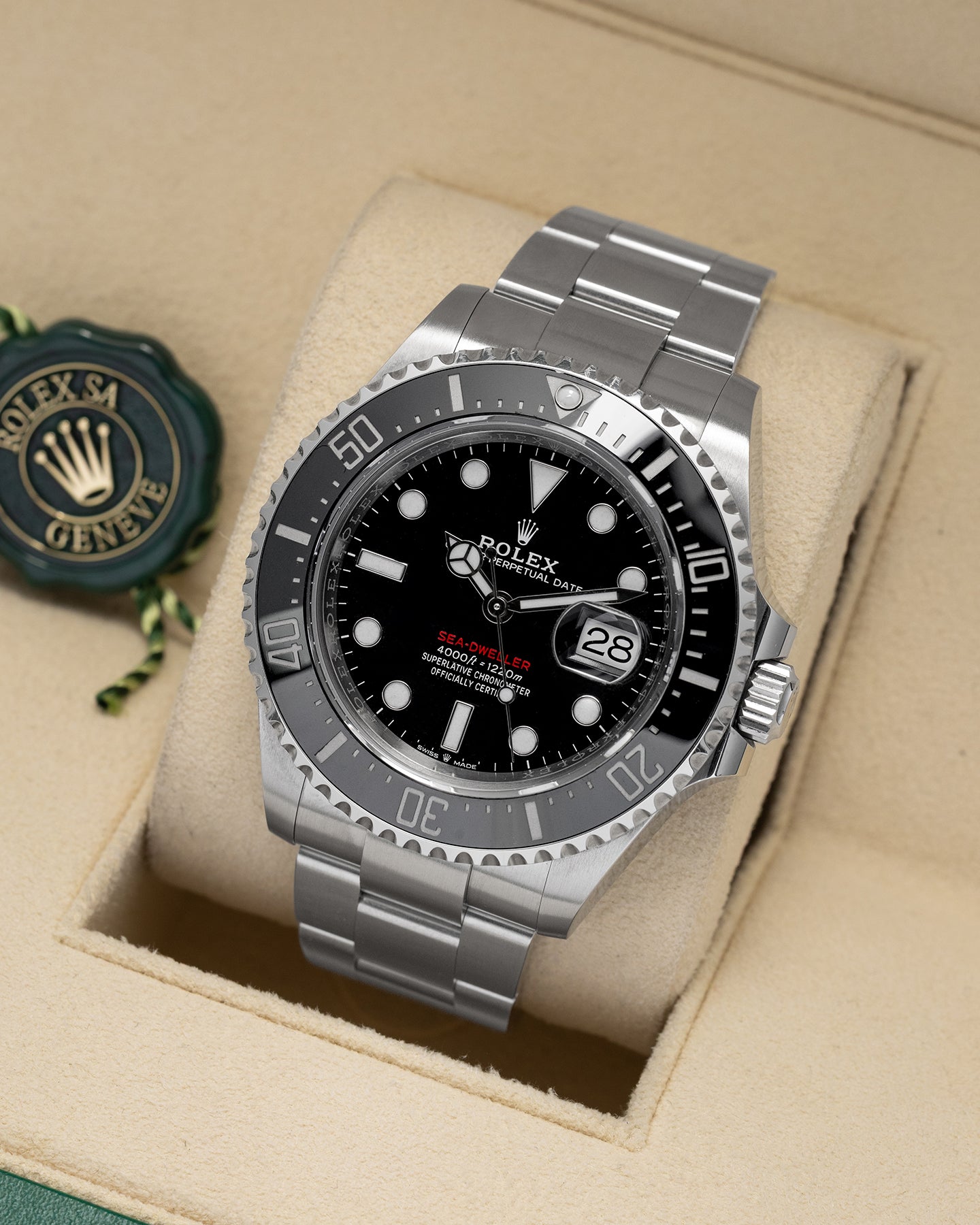 Built for extreme environments and everyday rotation alike, the Sea-Dweller 126600 stands apart in the category of professional sport watches. The 43mm steel case houses a helium escape valve and a ceramic timing bezel designed for serious diving use. Its black dial, accented by red lettering and luminous markers, keeps everything easy to read. Inside, the Caliber 3235 delivers strong accuracy for 70 hours. A cornerstone among modern Rolex watches.