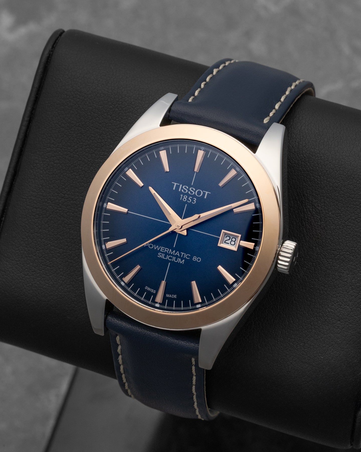 The T927.407.46.041.00 pairs traditional materials with modern engineering. The steel case and rose gold bezel create contrast against a rich blue dial finished with crisp applied indexes. Inside, the Powermatic 80 automatic calibre features a silicon balance spring and extended 80-hour reserve, designed for long stretches off the wrist. For collectors seeking accessible dress watches with thoughtful mechanics, this Gentleman delivers substance in a clean, tailored format.