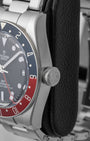 The M79830RB is the kind of GMT that feels right on the wrist from the start. The red and blue bezel gives the watch instant character, while the 41mm steel case and matte black dial ground it in everyday practicality. Inside, the MT5652 movement delivers a 70-hour power reserve and true GMT functionality. It’s a sport watch built for travel, but it looks just as good when you’re not going anywhere.